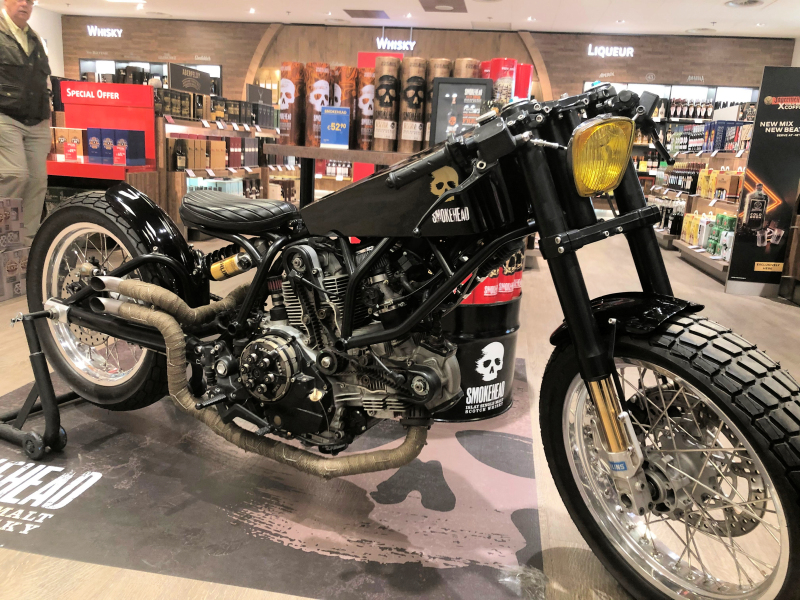 En zo komen we, ruim na een ieder die achter ons in de “gewone” rij stond, weer in Niemandsland, waar de belastingen zo lekker laag zijn, en melden we ons weer bij de Rokerijen, waar dezelfde voorraad als gisteren in de laptopkoffer verdwijnt en we onze eerste Bike Week foto schieten. So far, so good, en we begeven ons richting G13 waar we bovengronds nog wat rondhangen, de inwendige mens verzorgen, en uiteindelijk tegen 10-en afdalen naar de bushalte van G13. Een dik half uur later rollen we de A4 over, en roltrappen we (de trap is naar het vliegtuig gerold, maar is helaas geen roltrap 😊) de 767-300 in naar onze ruime zetels. De pechvogel van gisteren staat pal naast ons, volgens grond en technisch personeel (oude bekenden van gisteren 😉 ) nog steeds te wachten op de nieuwe klep.