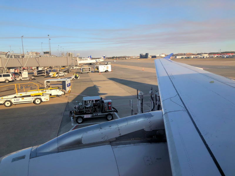 Dus moet er een pompwagen en opslagtank komen, en dat kan even duren, dus we vertrekken wat later. En even later nog iets later. Ik zie een patroon, deja vu, en bereid me voor op een nachtje Airporthotel. Zeker als na een 3 kwartier de mededeling wordt gedaan dat je best wel even van boord mag, om de benen te strekken, als je je bagage maar meeneemt. De meeste mensen blijven zitten, en de verzorging is vandaag minimaal, geen water, zakje pretzels of een stroopwafel, helemaal nada. Deze heenreis met problemen komt niet in onze United Top Tien, dat is zeker. Na weer een ruim kwartier is er eindelijk een tankauto onderweg (naast ons vliegtuig stonden er minstens 6) en gaan de pompen aan. Marion verbaast zich dat we tijdens deze handelingen mogen blijven zitten, en gelijk heeft ze. De pompeniers doe er en ruim half uur over en dan gaan we eindelijk de lucht in.