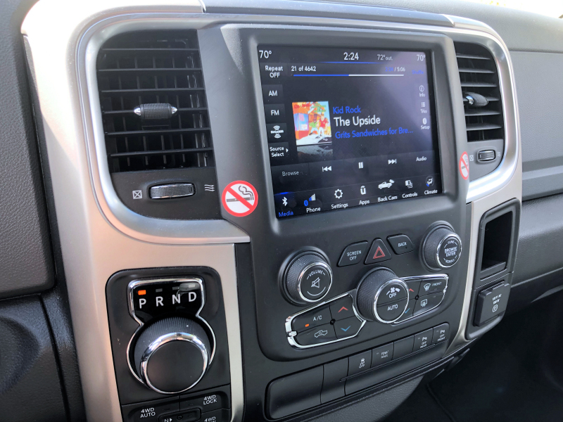 Alle wielen kunnen drijven, en het torretje is van Hemi, 5.7 litertjes, dat is een must. En de benzine is hier al niet al te prijzig, maar word op dit moment nog goedkoper door het [mexicaanse bier] virus. En de dollar zakt mee, dus we worden hier slapende rijk 😉. Het parkeren van het beest is wel even wennen, want hij is nog wat lomper dan de gemiddelde Suburban of Expedition, en ook de instap is een stukje hoger, maar dit komt ten goede aan het uitzicht, want je kijkt vrij makkelijk over de voornoemde grote SUV’s heen. Behalve het rommelde geluid buiten de auto wil het van binnen ook wel rommelen, er zit een knappe stereo in die geweldige muziek afspeelt. Dat kan ook niet anders, want die muziek komt van mijn telefoon 😊. Op het bedieningspaneel, voorzien van veel knoppen en touchscreen zit ook de versnellingspook, dit geval een draaiknop. Dat is even wennen. En er zit zelfs een 115V stopcontact naast de gebruikelijke 12V en USB-uitgangen. Dat je het maar hebt.